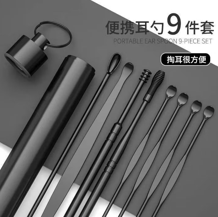 叙年挖耳勺6件套成人家用便携式螺旋掏耳勺套装不锈钢掏耳朵采耳工具 黑色7件套+瓶