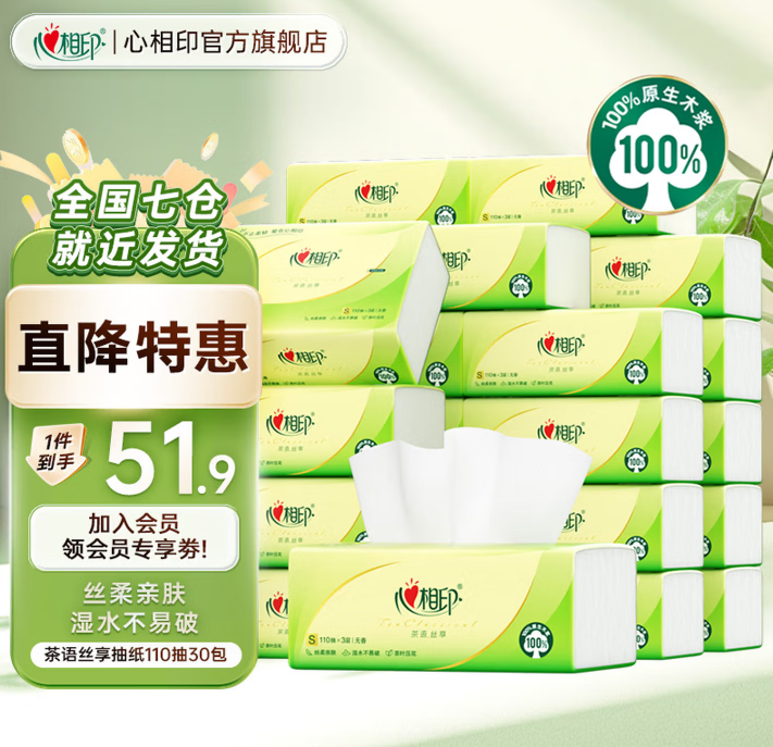 心相印抽纸巾茶语丝享系列面巾纸3层家庭实惠装卫生纸餐巾